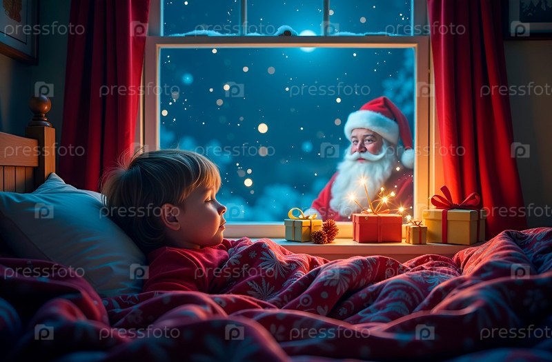 Ребенок спит в уютной кроватке в рождественскую ночь, а Санта-Клаус смотрит на него из окна. Ждет подарков. Сказочная атмосфера