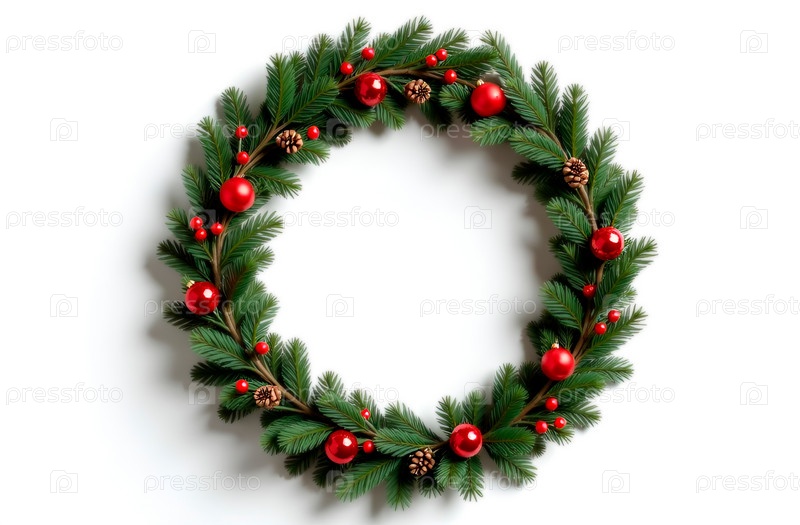 Рождественский венок из еловых веток, украшенных красными ягодами, шишками и шарами на белом фоне. Копировать пространство, макет, макет, дизайн. Минимализм