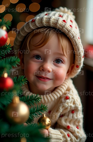 Маленькая радостная девочка в вязаном свитере и шапке возле елки, украшенной разноцветными украшениями и огнями, передающая дух праздника и сказки. Портрет крупным планом
