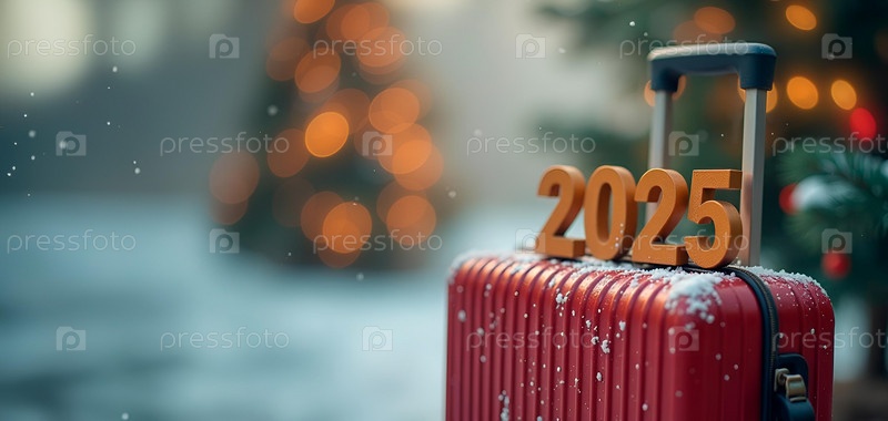 Цифры 2025 на чемодане. Направления путешествий, путешествия, поездки. Реализация надежд и мечтаний в Новом году. Крупный план, баннер, место для копирования. Снежный зимний день