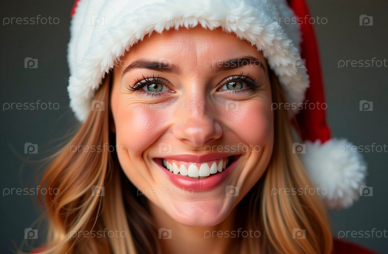 Крупный план лица женщины в красной шапке Санты с ослепительной улыбкой. Иллюстрация для рекламы стоматологических услуг, стоматолога. Уход за полостью рта. Скидки и специальные предложения на рождественские распродажи