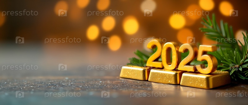 Цифры 2025 из золота на золотых слитках. Новогодняя атмосфера, рождественская елка. Баннер с копировальным пространством