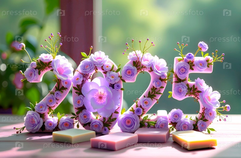 Цифры 2025 украшены фиолетовыми цветами и кусочками натурального мыла ручной работы