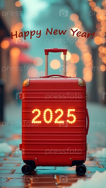 Цифры 2025 на красном чемодане с колесами. Зимняя улица со снегом. Новогодняя поздравительная надпись, открытка. Туристические направления, путешествия, поездки. Реализация надежд и мечтаний