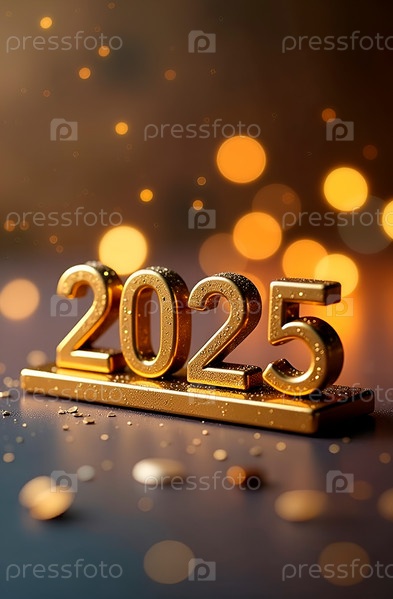 Цифры 2025 в золоте на золотом слитке. Новый год, праздничное боке. Роскошь, богатство, финансы. Темный фон
