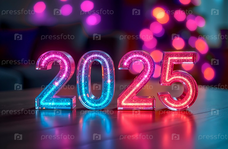 Неоновые стеклянные светящиеся цифры 2025 на темном фоне с эффектом боке