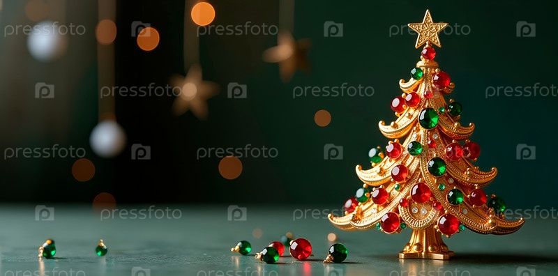 Рождественская елка из золота, украшенная зелеными и красными драгоценными камнями. Баннер с копировальным пространством