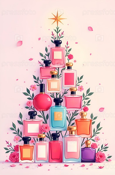 Рождественская елка из флаконов духов, украшенных лепестками роз и цветами. Парфюмерия, ароматы в розовых тонах