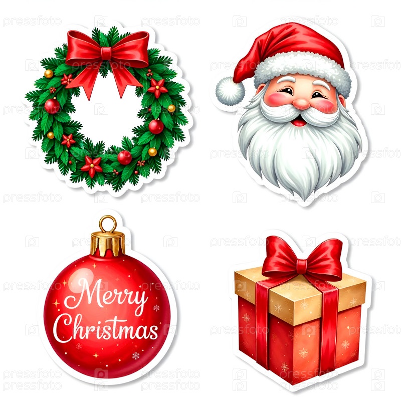 Рождественские подарочные наклейки. Санта-Клаус, елочный шар, подарок, венок. Утепленные