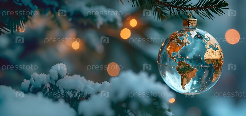 Баннер с елкой, украшенной стеклянным шаром с золотыми континентами. Концепция экологического сознания и устойчивости будущего. Экология и сохранение планеты Земля. Место для копирования, для текста