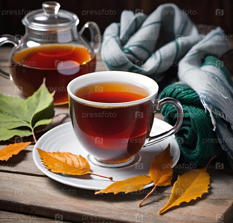 Осеннее настроение. Чашка чая, осенние листья, плед, шарф ИИ