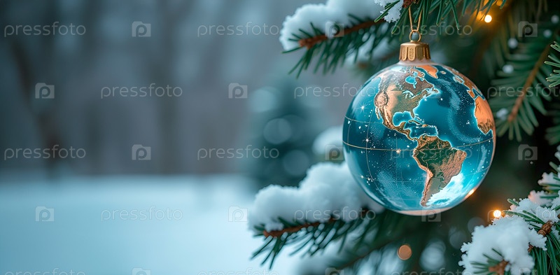 Баннер с елкой, украшенной стеклянным шаром с золотыми континентами. Концепция экологического сознания и устойчивости будущего. Экология и сохранение планеты Земля. Место для копирования, для текста