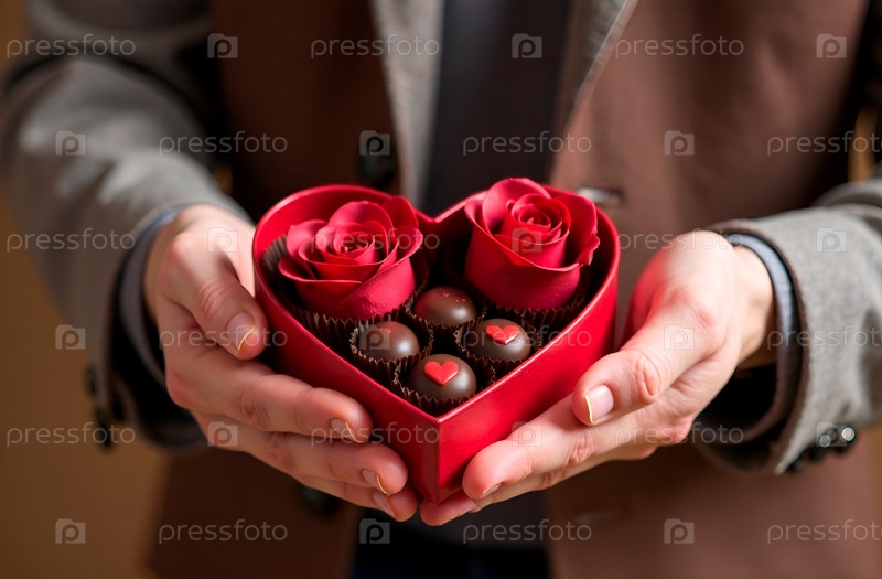 Красная подарочная коробка в форме сердца с красными розами и шоколадом, которую держат в руках на теплом фоне, символизируя любовь и заботу. Крупный план рук мужчины
