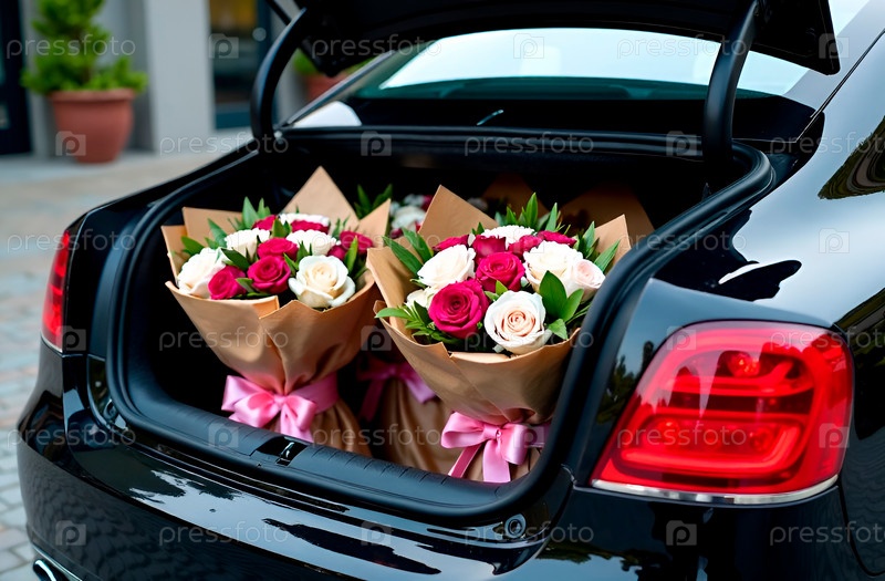 Букеты роз в багажнике черного роскошного автомобиля. День святого Валентина, женский день