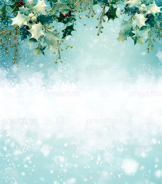 Рождественский фон с падубом на синем фоне, покрытом снегом, рамка с местом для копирования. Голубые тона
