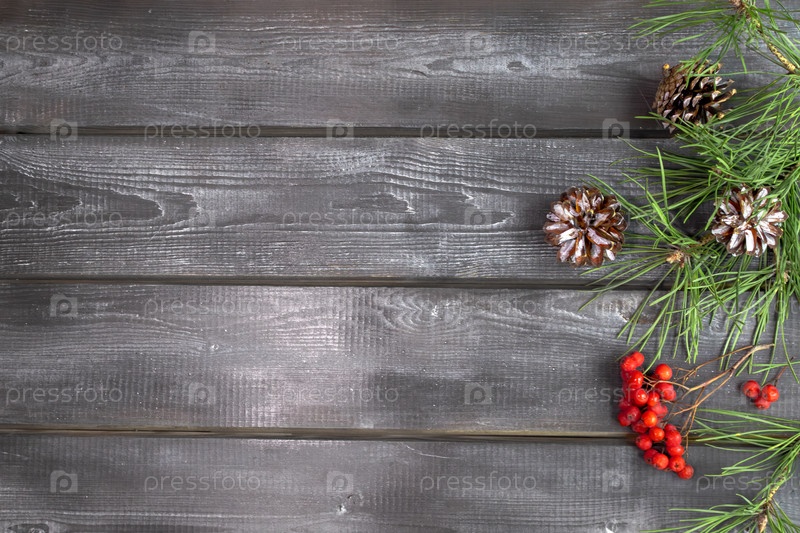 Деревянный фон с еловыми ветками, шишками и ягодами рябины. Натуральный рождественский декор