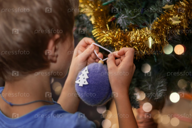 Мальчик украшает рождественскую елку креативными безделушками. Крупный план