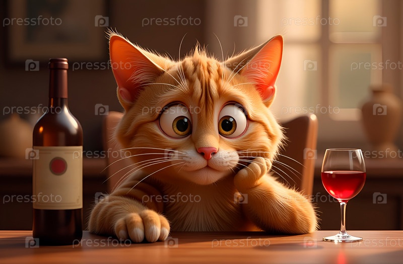 Подавленный мультяшный смешной кот сидит за столом, подперев голову лапой. Рядом бутылка и бокал вина. Синий понедельник