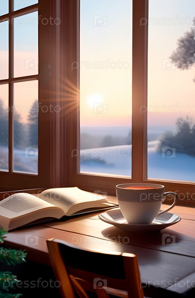 Чашка чая и книга на столе у окна с зимним пейзажем. Крупный план. Уютное уединение. Избирательный фокус, размытость