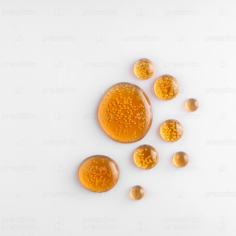 Круглые золотистые капли масла или сыворотки на белом фоне, ретинол, капли сыворотки витамина С