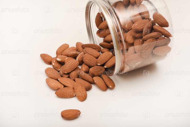 Целый миндаль в банке на белом фоне