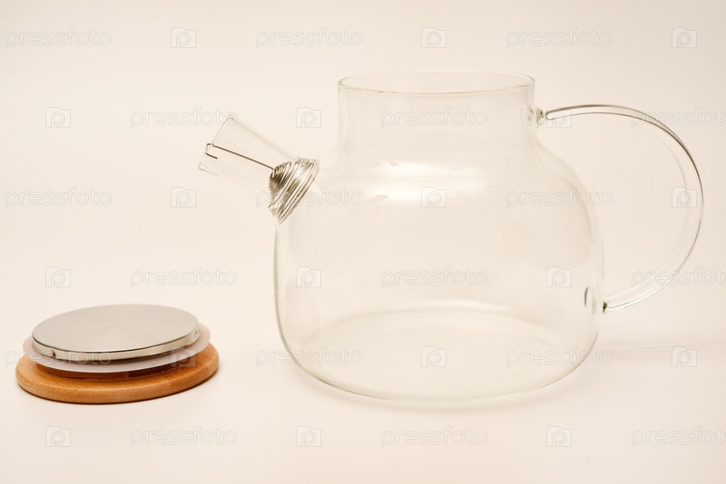 Стеклянный чайник с деревянной крышкой на белом фоне