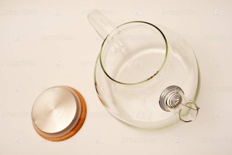 Стеклянный чайник с деревянной крышкой на белом фоне
