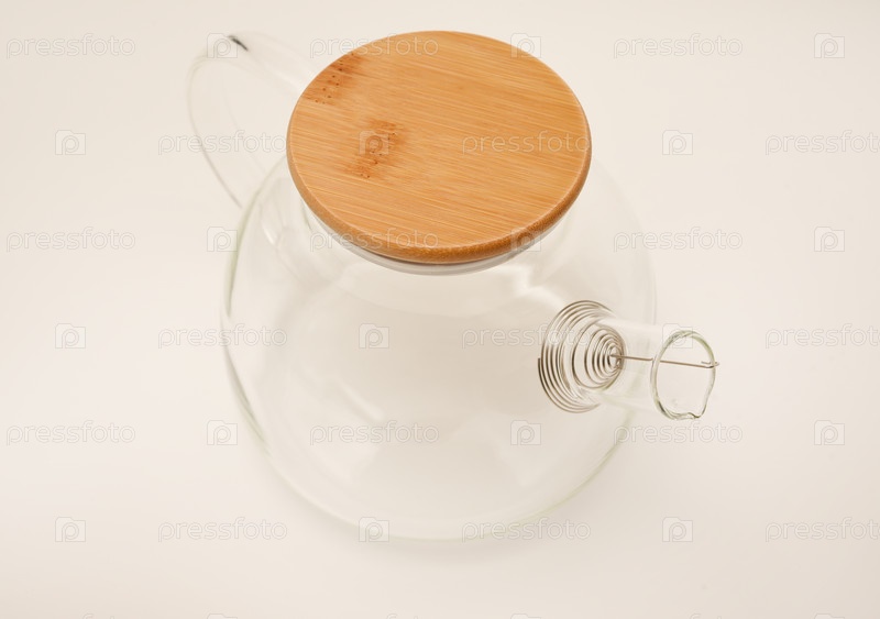 Стеклянный чайник с деревянной крышкой на белом фоне
