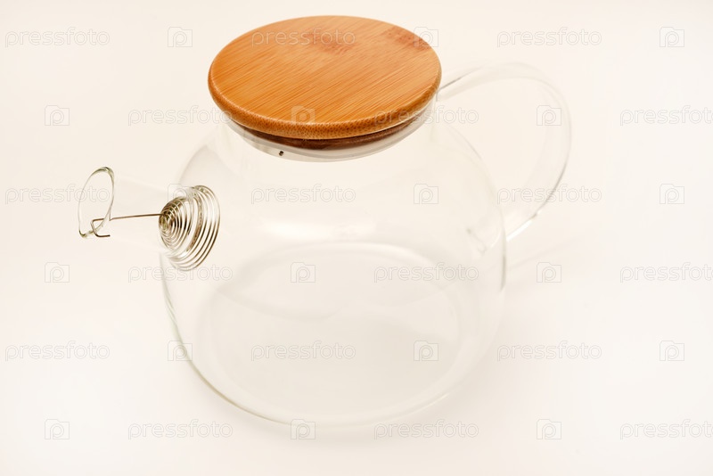 Стеклянный чайник с деревянной крышкой на белом фоне