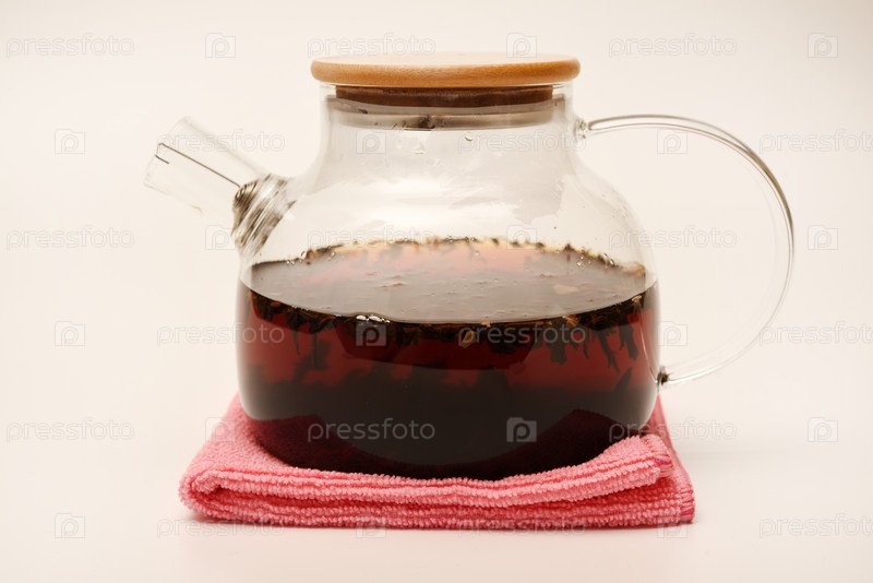 Стеклянный чайник с деревянной крышкой на белом фоне. Чайник с заварником внутри