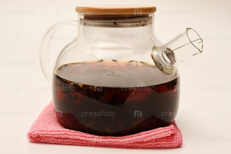 Стеклянный чайник с деревянной крышкой на белом фоне. Чайник с заварником внутри