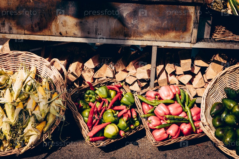 Спелые овощи и фрукты на ферме, лежащие в вертикальной деревянной корзине, продуктовый магазин