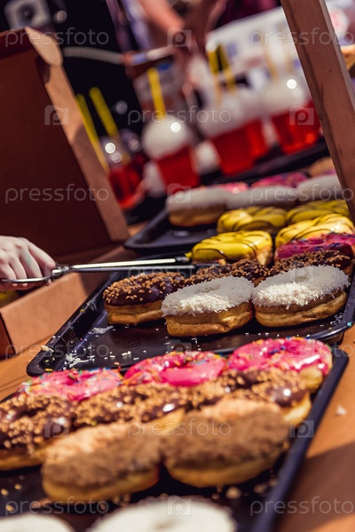 Пончики на прилавке магазина, уличные десерты продаются на фестивале еды