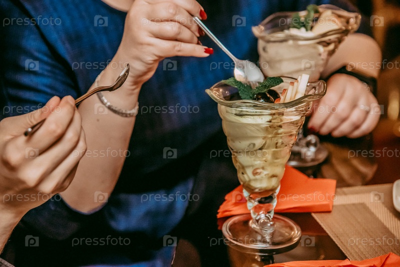 Женщина ест сладкий десерт в стеклянной кружке в ресторане, деликатесную еду в пекарне