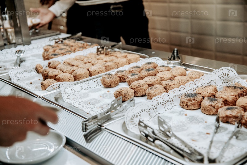В ресторане отеля на столе сладкие десерты, в кафе-столовой продаются различные деликатесы