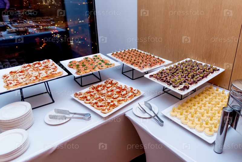 Ресторан отеля типа «шведский стол», кофейный перерыв, стойка с едой на столе, белая скатерть
