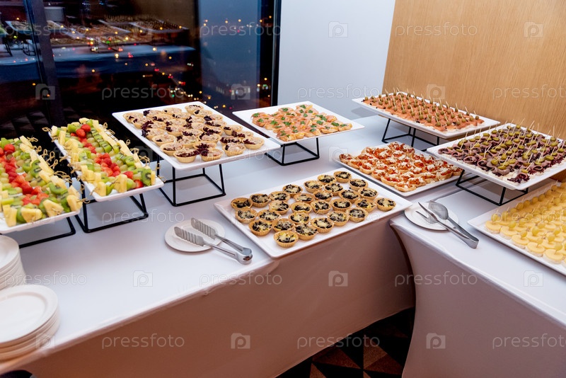 Шведский стол в ресторане отеля, кофе-брейк на мероприятии, еда на подставках на столе с белой скатертью