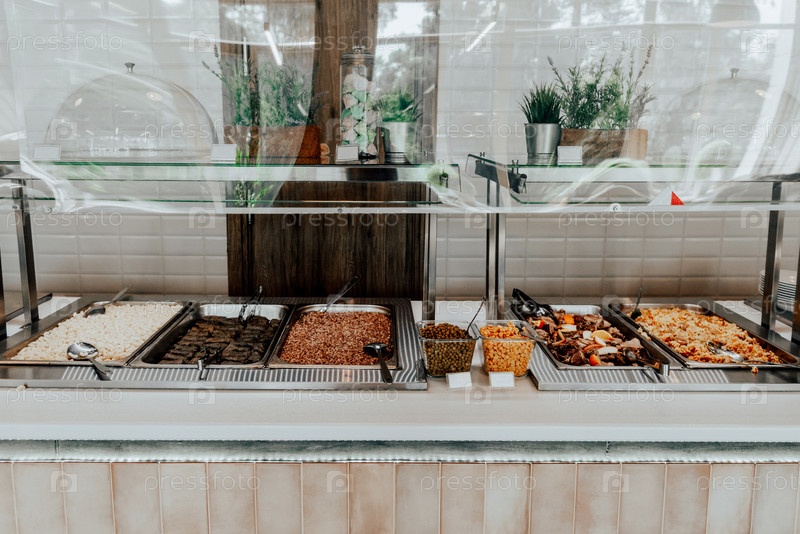Шведский стол в ресторане отеля, разнообразные блюда на подносе, ужин в столовой