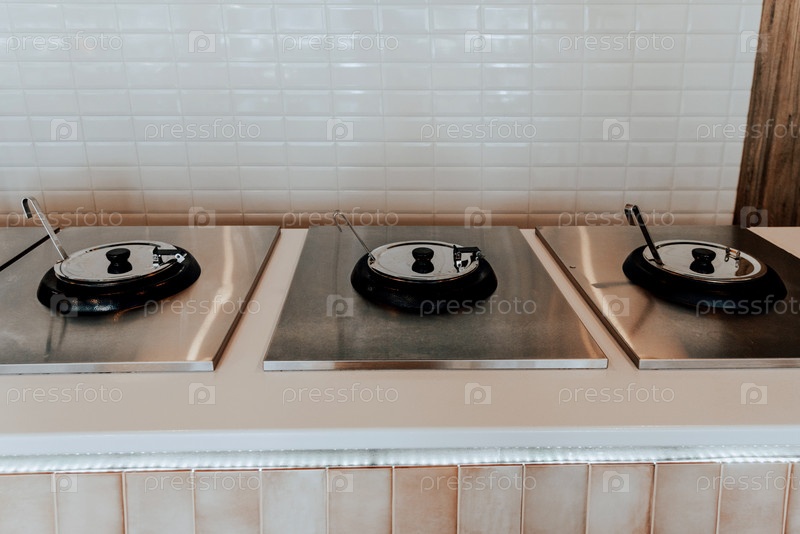 Шведский стол в ресторане отеля, разнообразные супы в горшочках, ужин в столовой