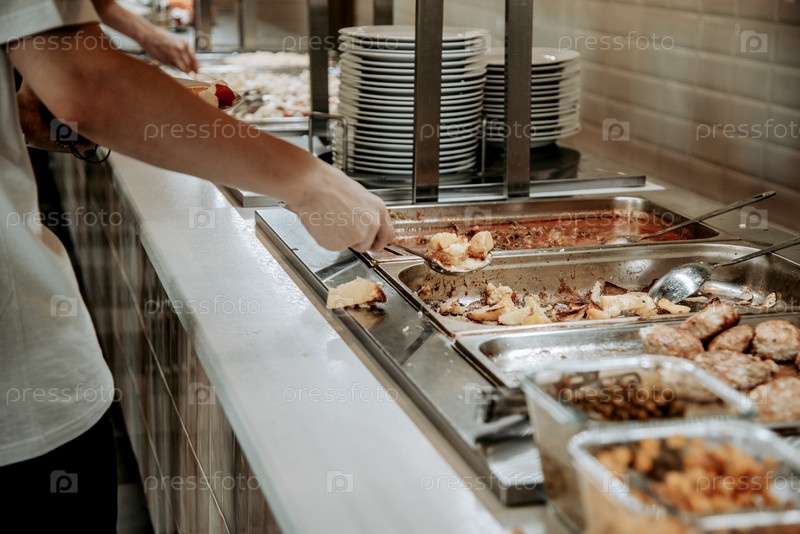 Шведский стол в ресторане отеля, разнообразные блюда на подносе, ужин в столовой