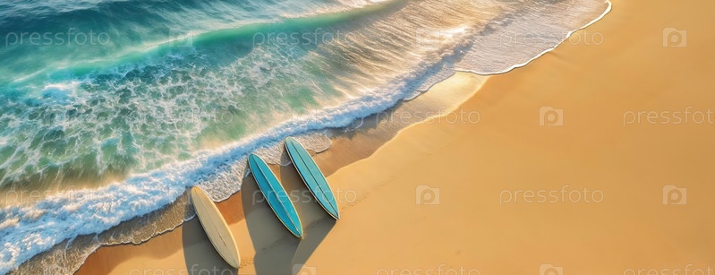 Три доски для серфинга лежат на песчаном пляже, на заднем плане — волны, мягко разбивающиеся о берег под ясным голубым небом