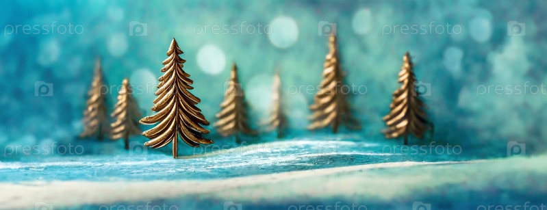 Золотые рождественские елки в мистическом зимнем снежном пейзаже. Панорама с копировальным пространством, минималистичный фон