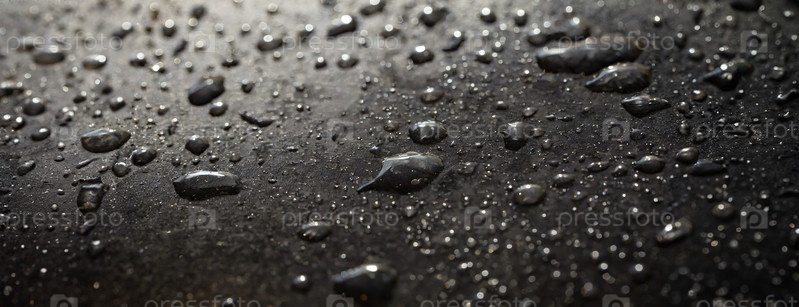 Крупный план капель воды на гладкой темной поверхности с размытым фоном. Панорама с копировальным пространством