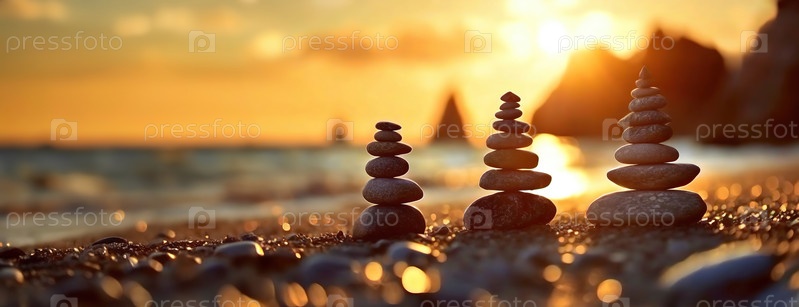 Галька балансирует на пляже на закате. Сложенные камни гармонично смотрятся на фоне океана. Нежные волны омывают берег, спокойные скальные образования