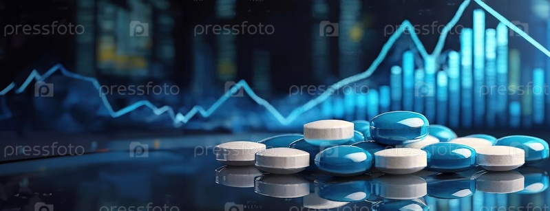 Синие и белые таблетки на фоне графика фондового рынка. Панорама с местом для копирования