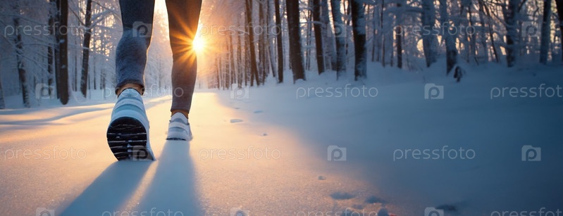 Зимняя прогулка: уединение и безмятежность в снежном утешении Ноги человека запечатлены на полпути в заснеженном лесу, олицетворяя тихое уединение и освежающую безмятежность зимней прогулки на рассвете