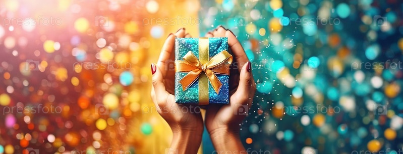 Руки держат сверкающую подарочную коробку бирюзового цвета с золотым бантом на фоне праздничного эффекта боке