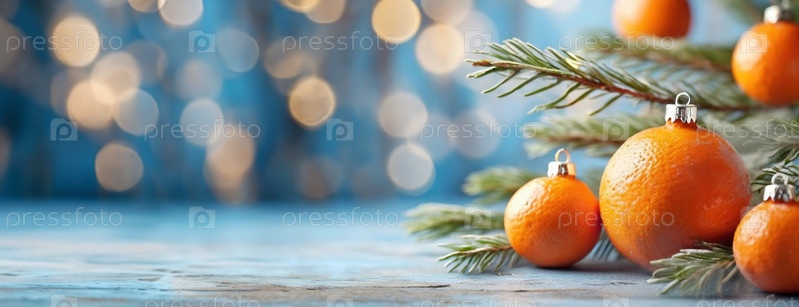 Апельсины как игрушки праздничные безделушки украшают рождественскую елку. Традиционный праздничный декор на фоне боке света. Свежий цитрусовый аромат смешивается с сосной, деревенским деревянным столом