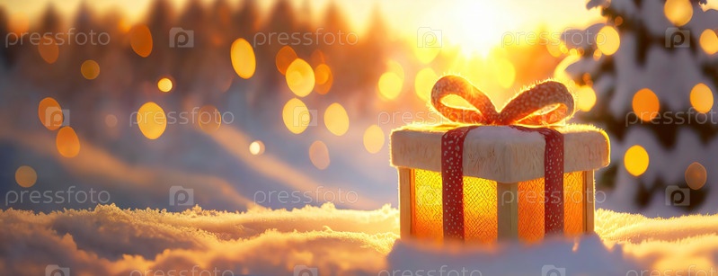 Подарок, завернутый в золотую ткань с красной лентой, лежит на снегу, на заднем плане теплый закат. Спокойный зимний момент, радость и тепло сезона дарения. Рождественские и новогодние праздники