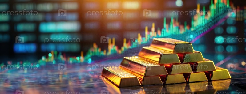 Сложенные золотые слитки мерцают на фоне цифровой финансовой диаграммы. Богатство и динамическая природа рынков. Концепция инвестиций и экономической мощи